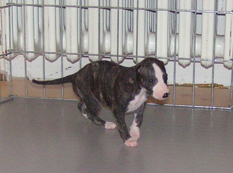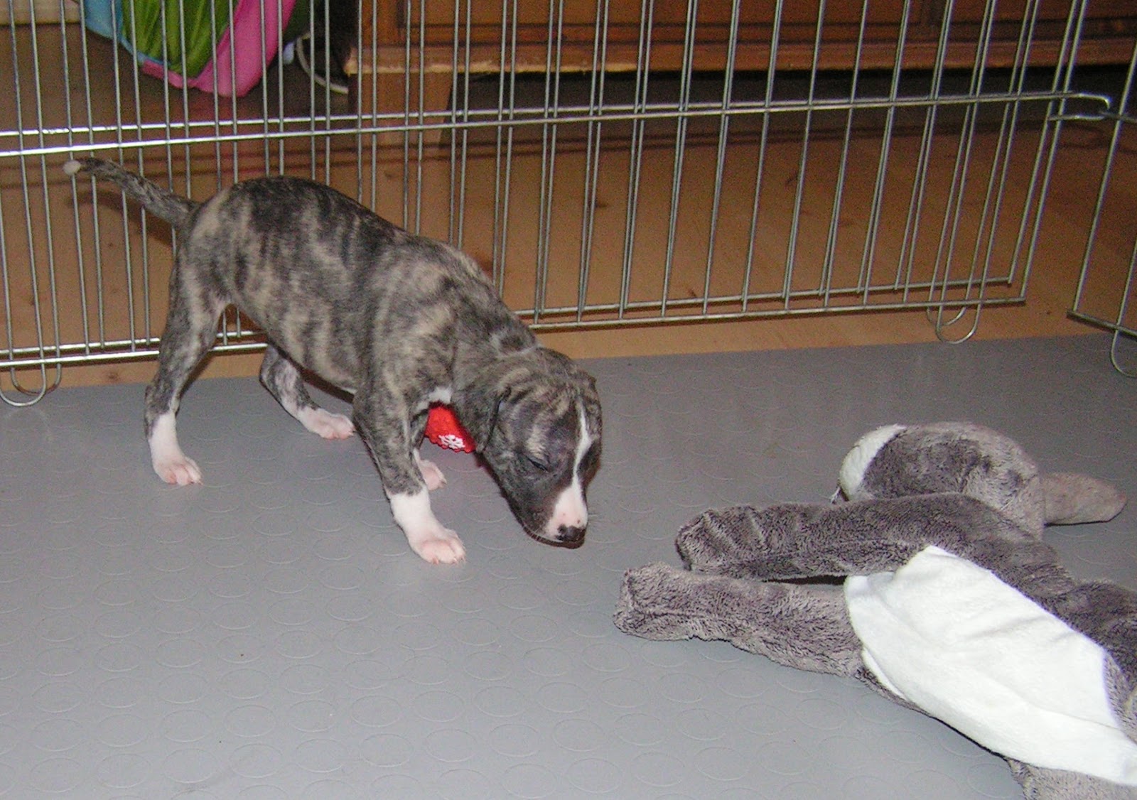 Die kleinen N’s sind nun vier Wochen alt. Sie entwickeln sich prächtig. In der nun beginnenden Entwicklungs- phase (oft Prägungsphase genannt) lernen die Welpen sich mit den zahlreichen neuen Reizen (Fernseher und Radio, Staubsauger, Blitzlicht der Camera, Spielzeug, Besucher, andere Hunde des Rudels etc.) positiv auseinanderzusetzen.