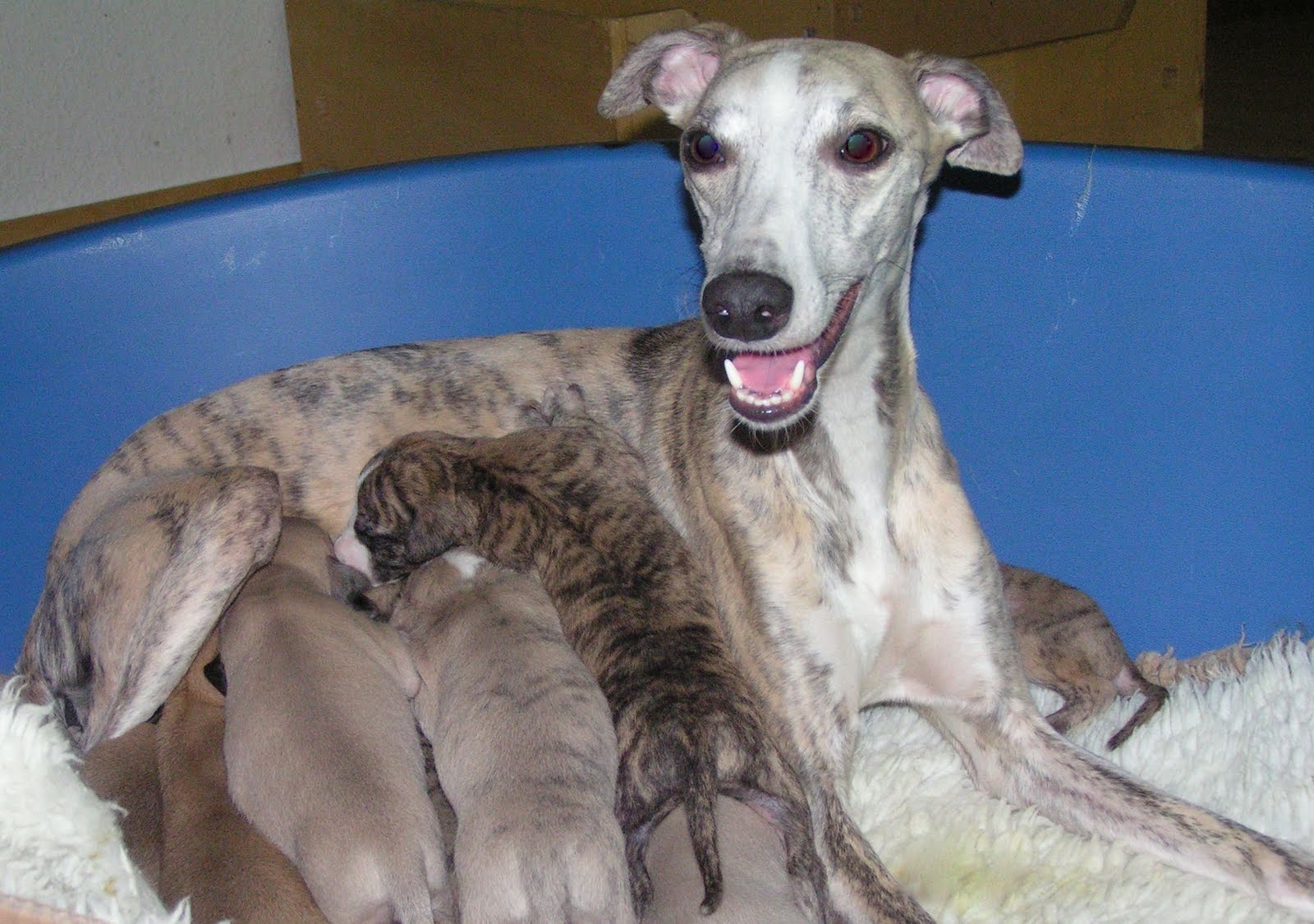 Nun sind die Welpen schon zwei Wochen alt. Die vegetative Phase neigt sich dem Ende zu. Nach und nach öffnen sie ihre Augen und Ohren. Sie reagieren zunehmend stärker auf Bewegungen und Geräusche. Erste Gehversuche werden unternommen. Bald werden die mutigsten versuchen, ihr „Nest“ zu verlassen, um die große, weite Welt (des Welpenzimmers) zu erkunden. Da Daisy ihre Kleinen fürsorglich pflegt und offenbar viel nährhafte Milch produziert, verliefen die ersten beiden Wochen absolut problemlos.