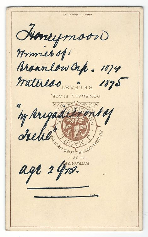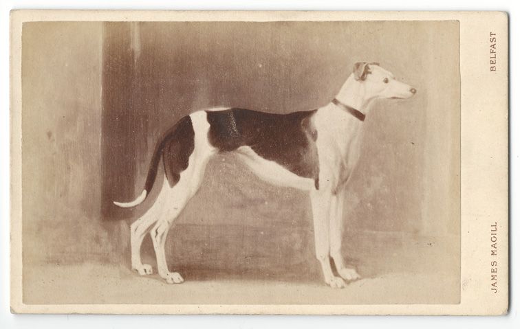 Besonders interessant ist die carte de visite mit dem Bild des Greyhounds Grey Honymoon, die im Fotostudio I. Magill, Belfast entstanden ist, da auf der Rückseite u.a. die Abstammung des Hundes vermerkt ist. ( Dieser Greyhound findet sich auch in der Datenbank greyhound-data.com.)